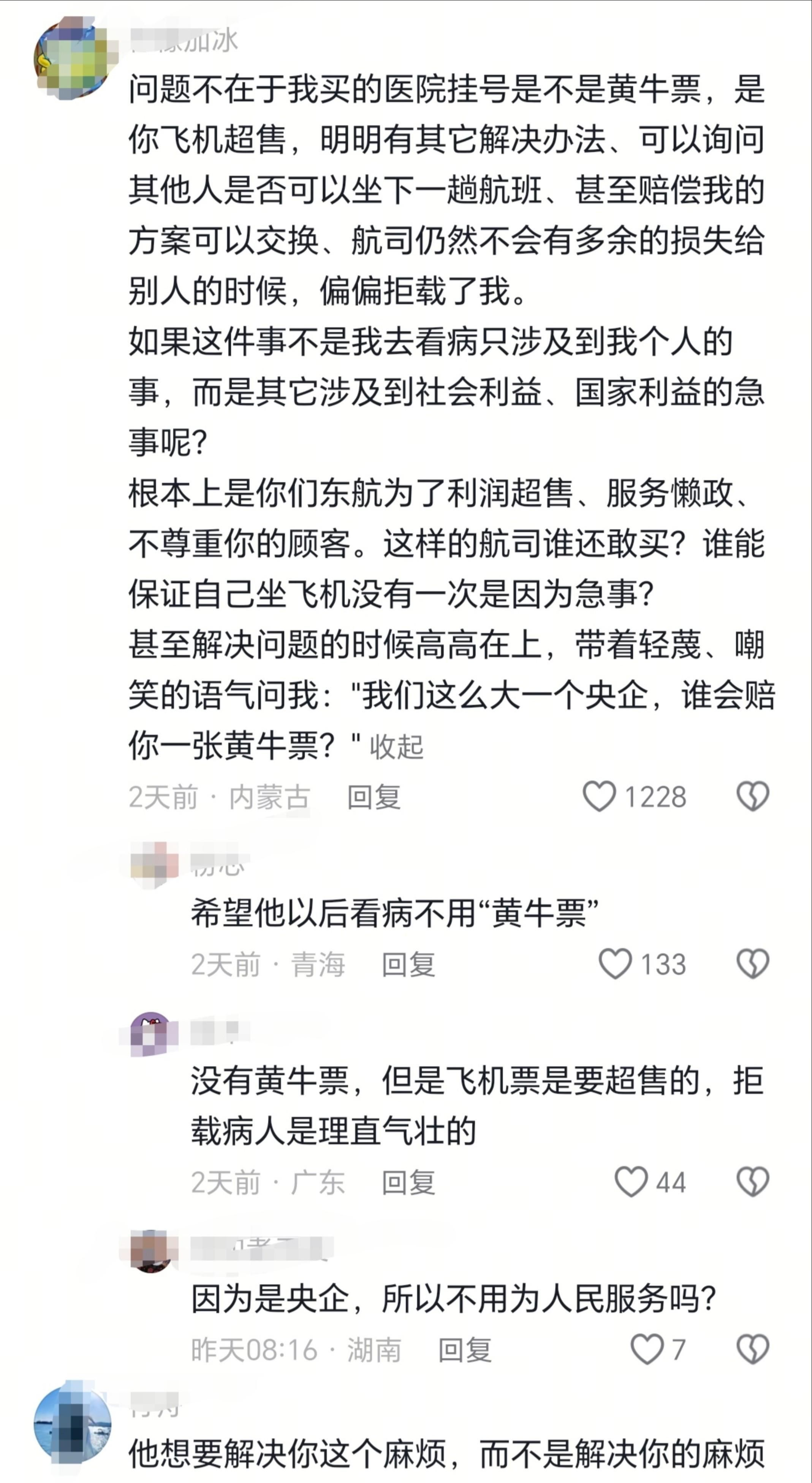 而东航的工作人员却一句又一句的称自己是“央企”,不可能让一个央企去赔黄牛票的。